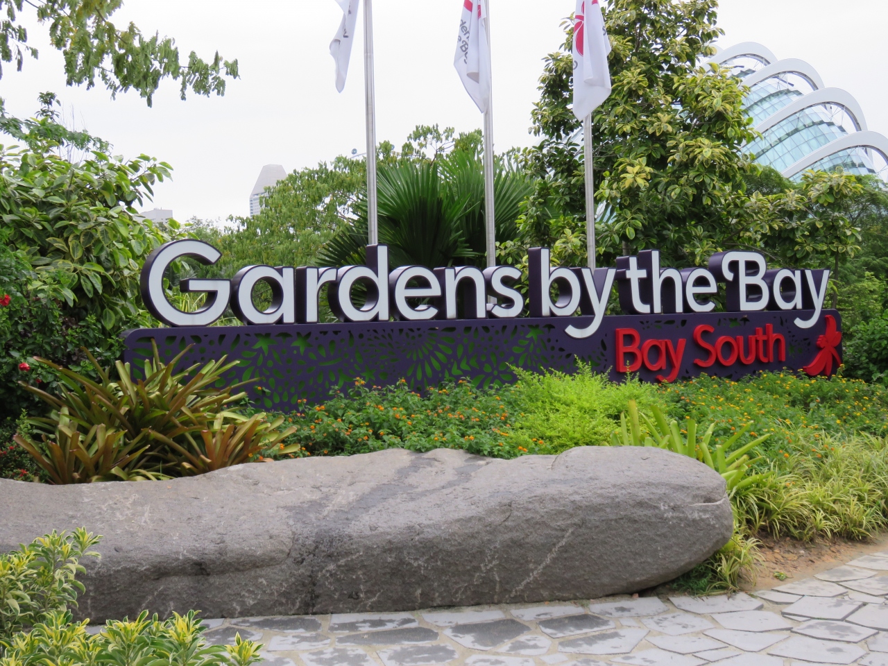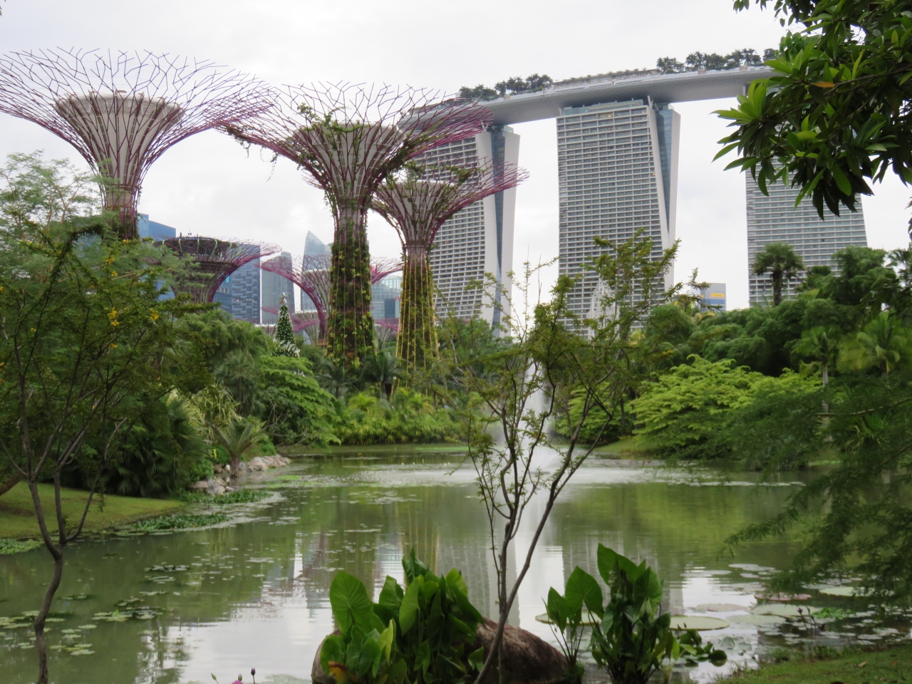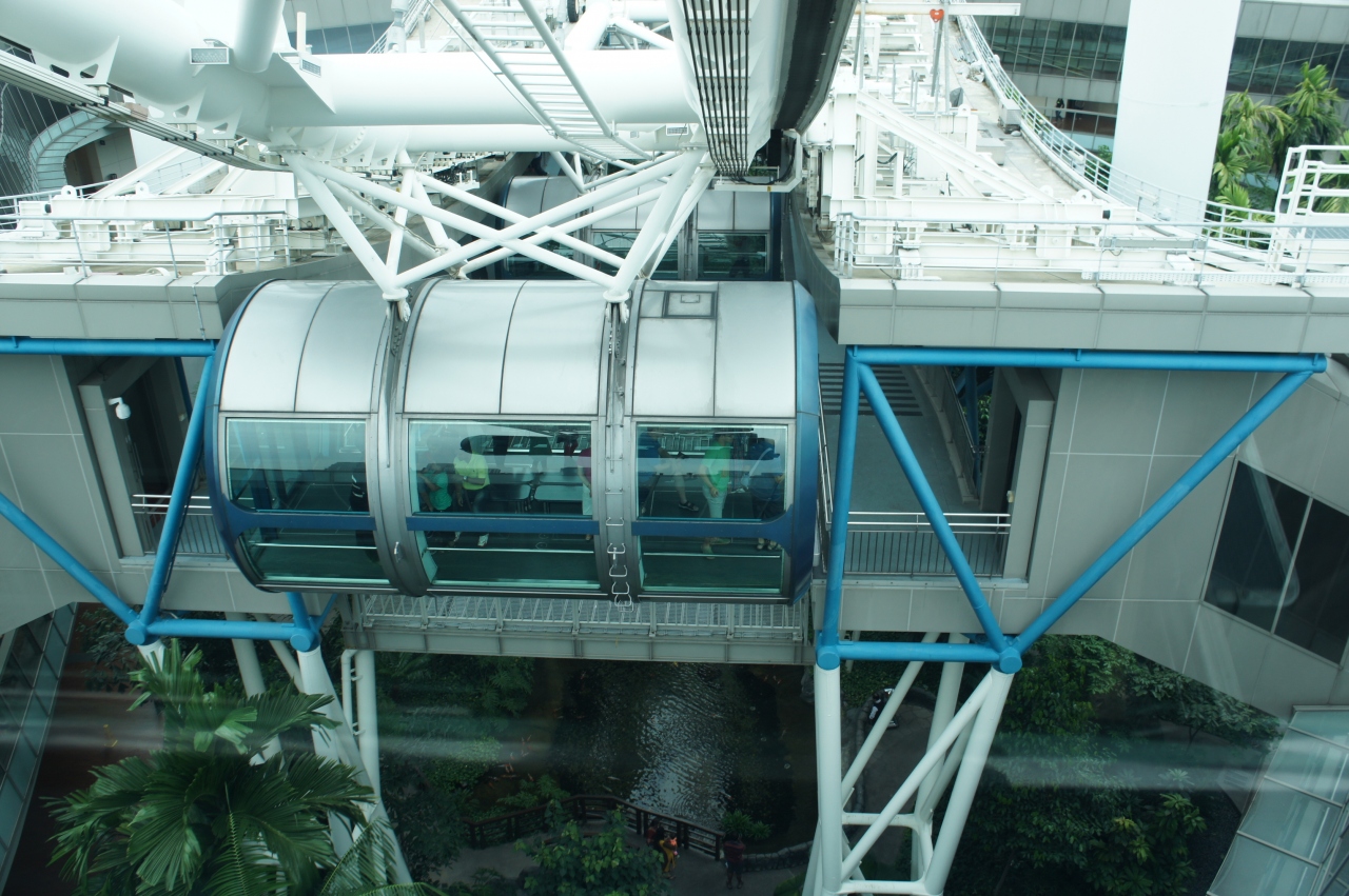ベイサンズホテルから連絡通路を渡っていきます。人工の大きなツリーがあり、夜は光のショーがあります。ショーをツリーの下で見ると見上げなければいけませんが、連絡通路から見ると多くのツリーが一度に目の前に見えて、より楽しめます。ドームに行くには園内を走る小型のバスに乗ると移動が楽です。近くに見えても歩くとけっこう遠く、暑くてつかれます。