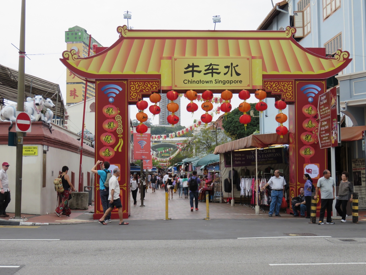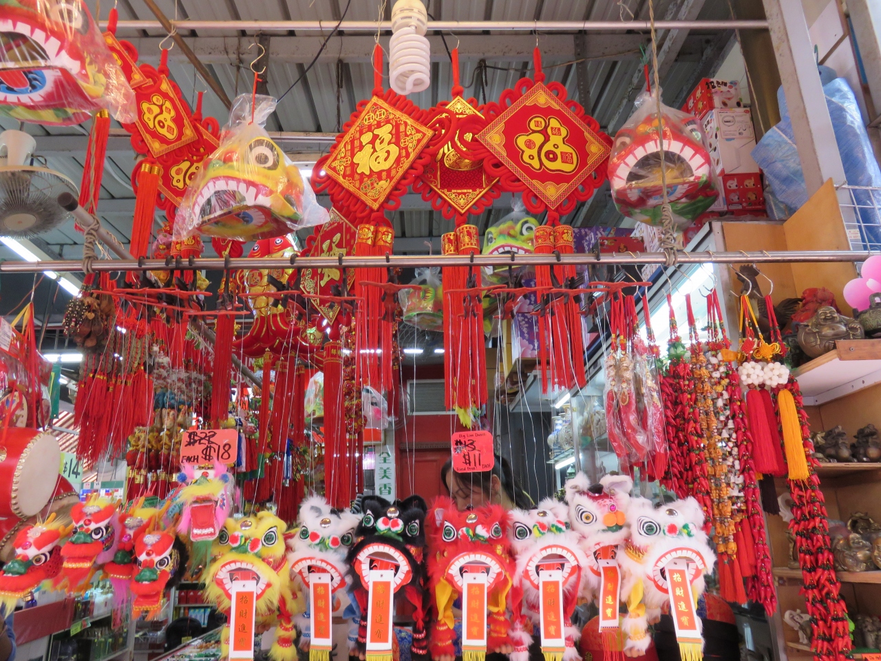 パゴダストリートをぶらぶら歩きました。雨季で曇っていてもけっこう暑いので、買っても買わなくてもお土産屋さんの奥まで入って体を冷やしながら散策しました。スーツケースにつけるタグを買いましたが、1個3ドルや3個10ドルなどいろいろです。赤や金の中国らしい飾り物が店頭にぶら下がっているのを見るとまさにチャイナタウンです。人が多くて歩きにくいぐらいでしたが活気があって楽しいと思いました。