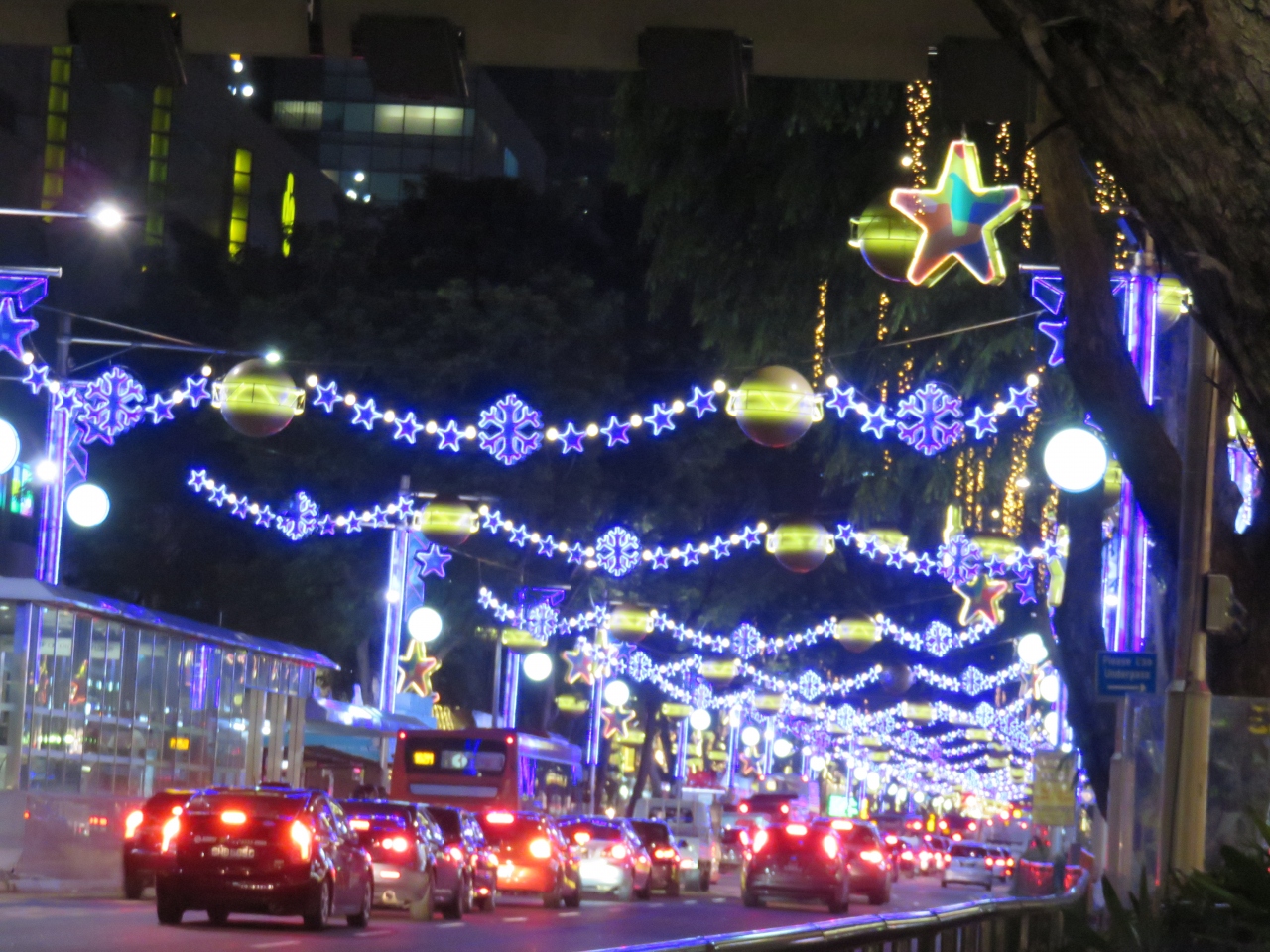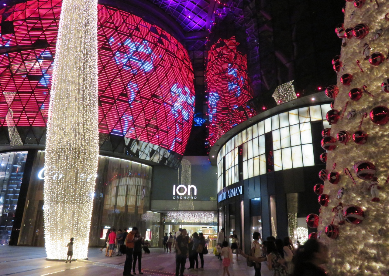 オーチャードの駅をでるとそこがオーチャードロードです。アイオンやシンガポール高島屋などよく利用しました。写真でよく見るモニュメントがあり人がたくさんいます。年末でしたがクリスマスの飾りがにぎやかで、夜はイルミネーションがきれいでそれを見るための人が歩道の石段に座っていました。日本のネオンやイルミネーションとは一味違い華やかで、楽しいひと時でした。