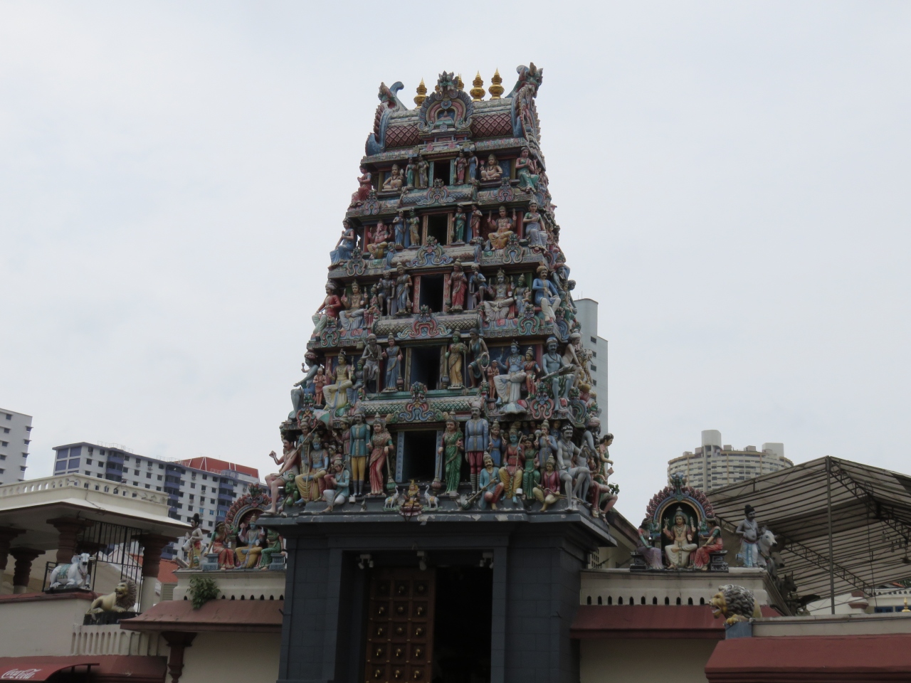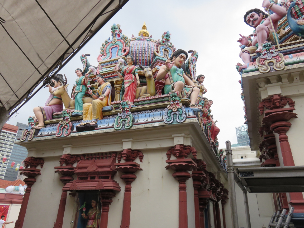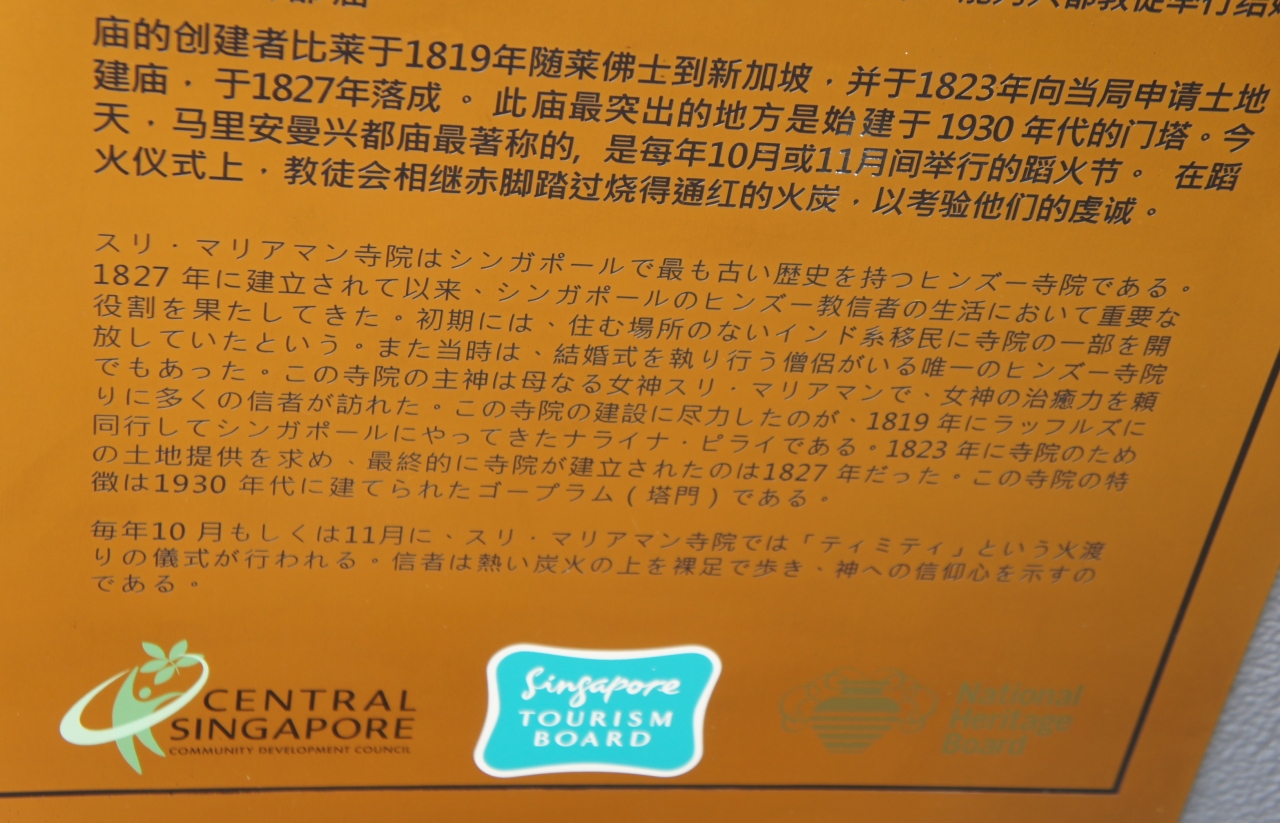 シンガポール最古のヒンズー教の寺院です。チャイナタウンの通りに面した場所にあり、これが見えたときは驚きました。こんな寺院ははじめて見たので強烈な印象を受けました。門塔の上は極彩色のヒンズー教の神々の彫刻でぎっしり。動物や植物も神も色彩豊かでリアル。外には観光客がいっぱいですが、中に入ると静かでゆっくり見学できました。写真をとらなければ無料です。写真は外の通りからきれいに撮れますので中に入って見学するのがお勧めです。日本語の丁寧な説明板がありました。
