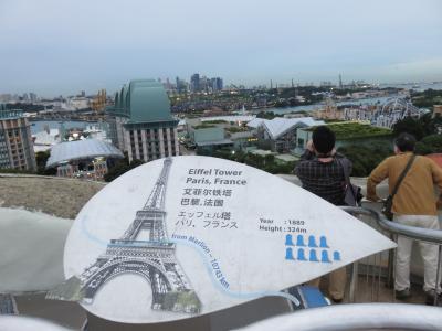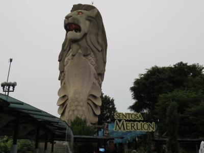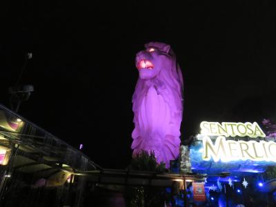 マーライオンタワーと書いてあるとおりマリーナベイのマーライオンより大きくて目が赤く光って威圧感があります。入場料を払って中に入り、マーライオン伝説のアニメ映画を見ます。日本語の字幕が横にでるので内容が理解できました。エレベーターホールで金色のライオンに入場チケット入れると大きな金色の記念コインがでてきます。エレベーターでライオンの口まで行き、頭までは階段を上がります。頭部は360度の展望でセントーサ島全体がよく見えます。夕方になるとビルがきれいな色にライトアップされていい感じです。