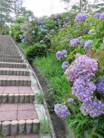園内のトレインに乗ってあじさい広場まで行きました。山の斜面や反対側の森もあじさいでいっぱいでした。山のほうは草がたくさん生えていて広すぎて手入れが少し間に合わないのかなと思いました。暑い日でしたが日陰になって涼しく歩けました。テントには新品種の珍しいあじさいが咲いていました。