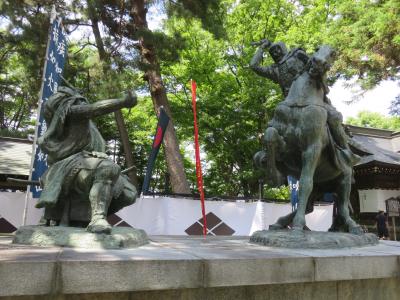 川中島合戦の行われた史跡公園です。長野ICの近くにあり駐車場が整備されています。ちょうど空いていてすぐに止めることができました。駐車場の前にお土産屋さんが数件ありました。八幡社の横には信玄と謙信の一騎打ちの像があります。