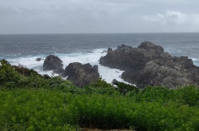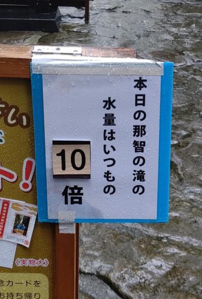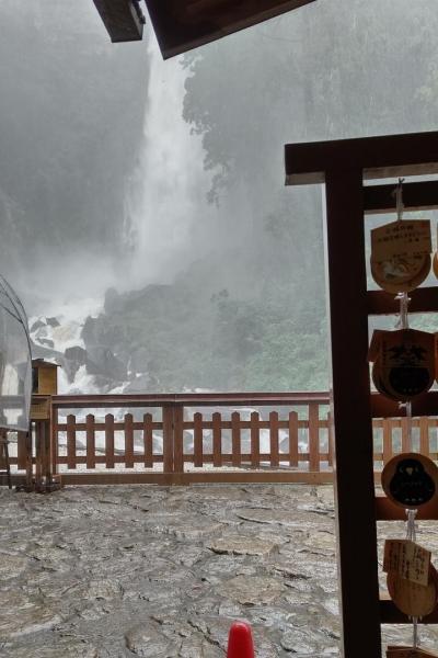 駐車場から石段を上がるころまでは小雨だったのですが上に上がると大雨。景色も曇って見えるほどでした。滝の水量はいつもの10倍ですという看板が出ていました。それほどすごい水量でゴーゴーとものすごい迫力で水が落ちてきます。写真を撮るのも一苦労で、びしょ濡れになりながら撮りました。