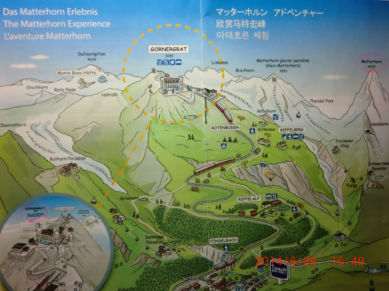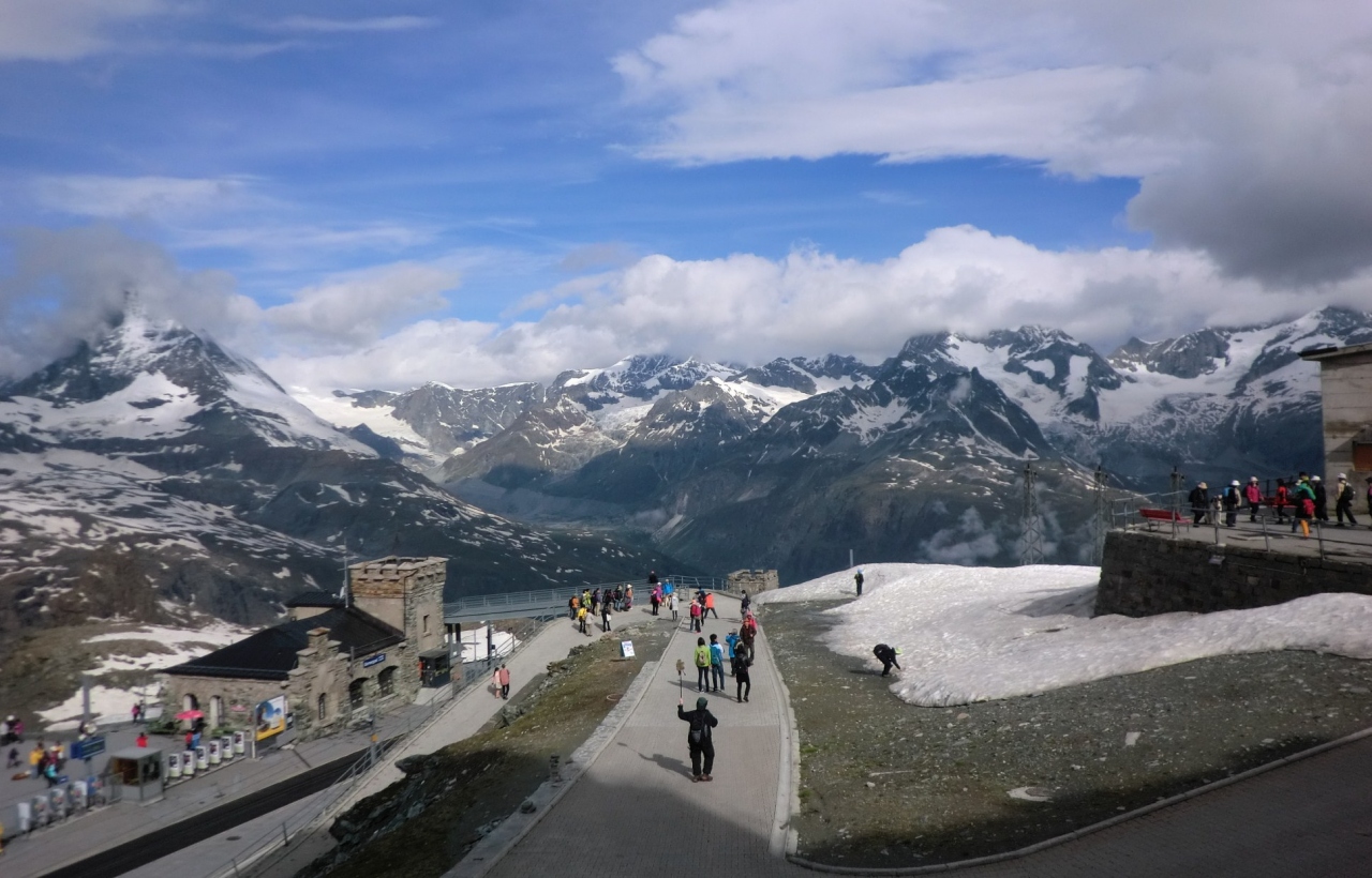 ツェルマット駅からはおよそ9km、30分ほどで着きます。標高3089mのゴルナーグラート駅からすぐ、広がる尾根に建つ展望台からはスイスの4000m級の雪を頂くペンニネアルプスが一望できます。晴れた日は尚更氷河のパノラマに引き込まれそうになります。展望台の中の設備も便利良く利用できました。