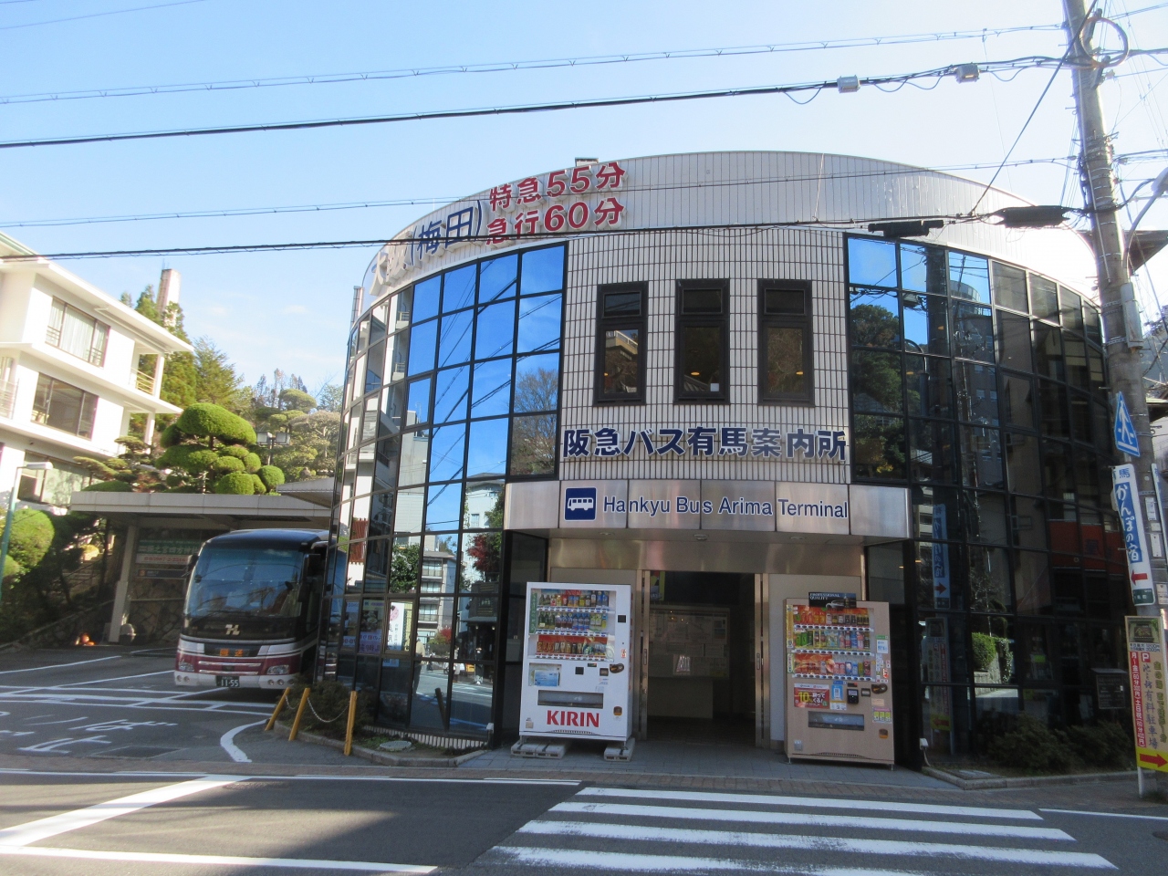 阪急高速バスが駐車している傍の2階建てのビルで1階がチケット売り場、2階が休憩所になっています。トイレあり、簡単なドリンクも買えてバスを待つ間、椅子に腰掛けて通りの向かいに建つ土産物屋や歴史のある神社の立木を楽しんだりして過ごせます。有馬温泉外の地図がもらえますし旅館に迎えの電話を掛けて貰えます。