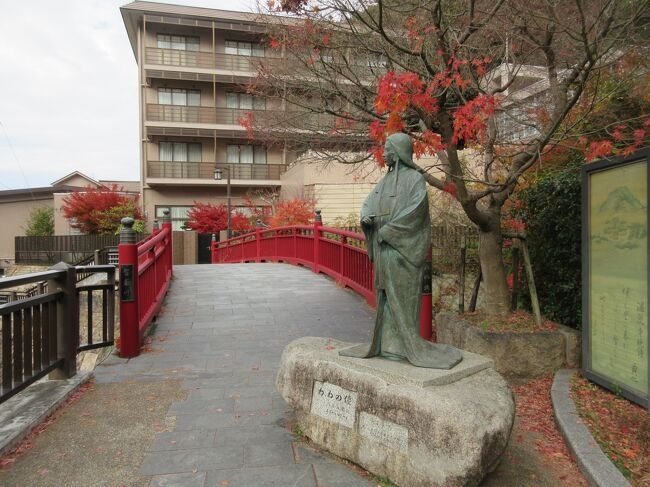 有間川にかかる朱色の橋ねねの像が立っていてすぐ近くにあります