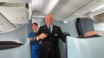 ブルーの機体にCAさんのブルーの制服が新鮮でした。機長さんやクルーの皆さんがとてもフレンドリーで安心感がありました。和食膳の機内食がとても美味しくてオランダのデルフト陶器に盛られていたのが嬉しいでした。操縦は勿論サービスがソツなく温かくハッピーでした。お酒入りのオランダのミニハウスが記念に配られました。機会があったら又乗ってみたいです。