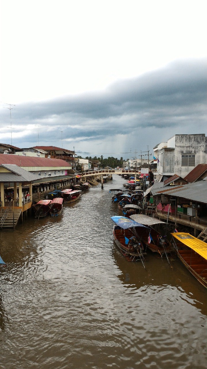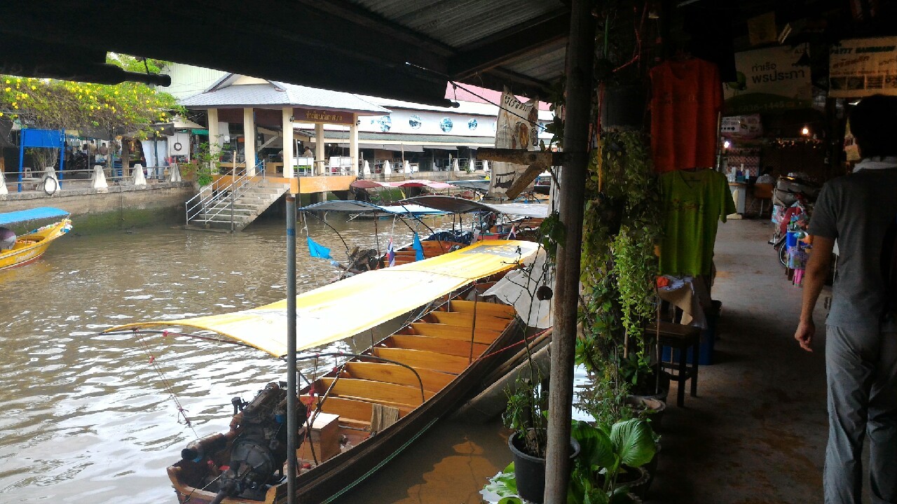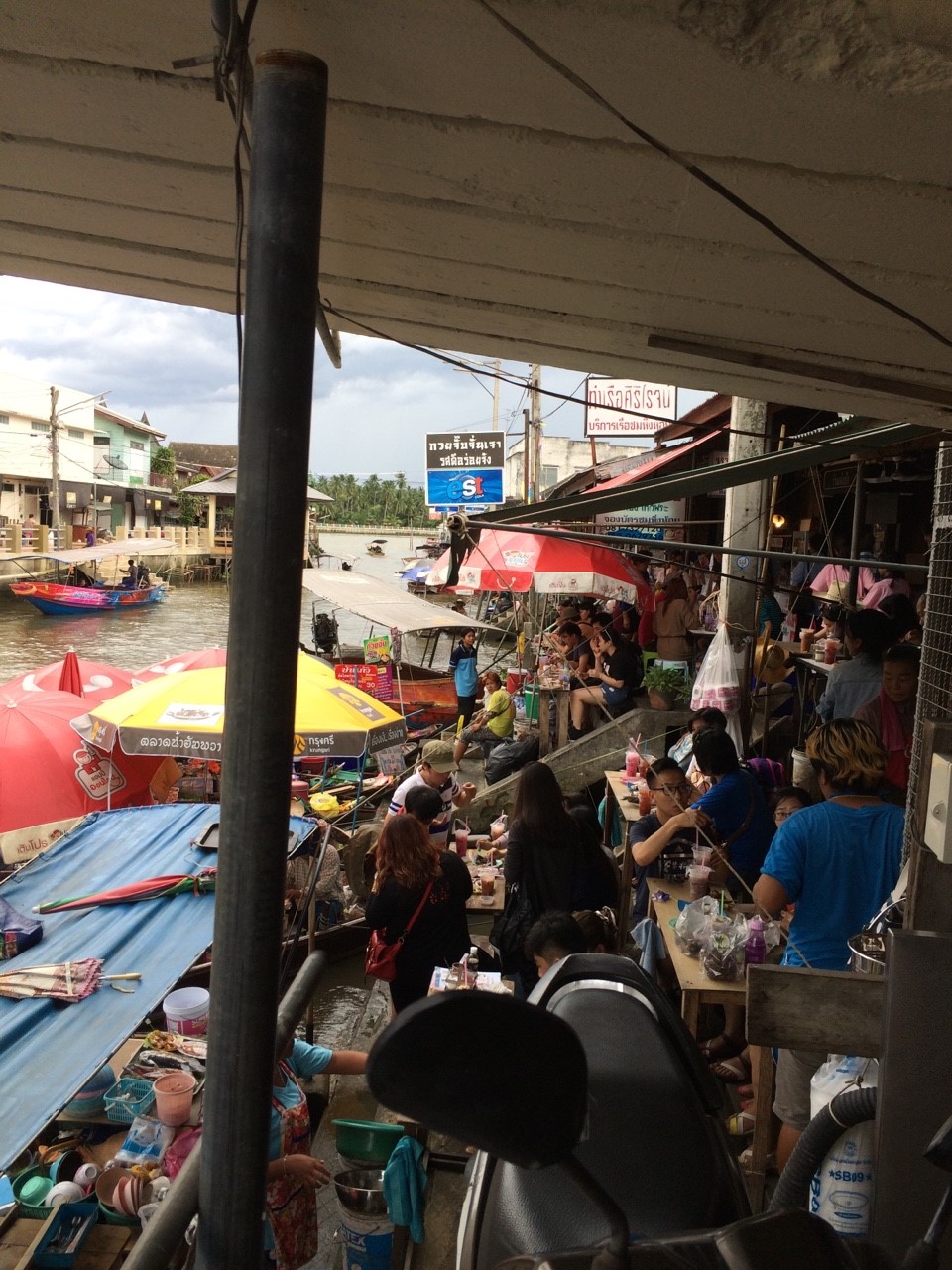 感想:川の両岸にお店がひしめきあっていて非常に歩きにくいです。人がごった返しています。道幅が狭いのに,交通整理されていないので,肩と肩がぶつかります。臭い匂いはしません。食事については,見た眼は良くないと思いますが,タイの文化に触れるには良い機会だと思います。岸に座って,船上で販売している食べ物を買って食べたり,岸のお店からテイクアウトしたりして自由に食べ物を食べていました。