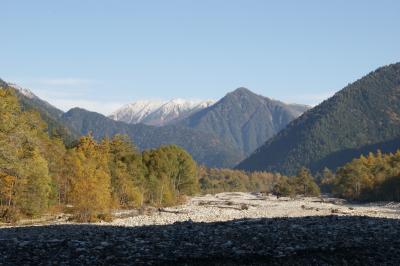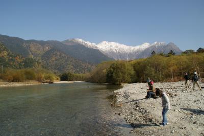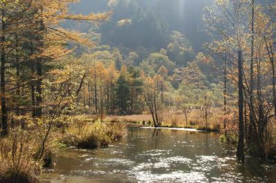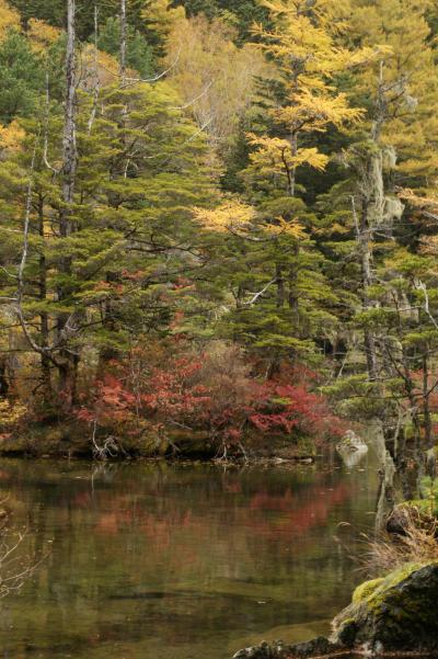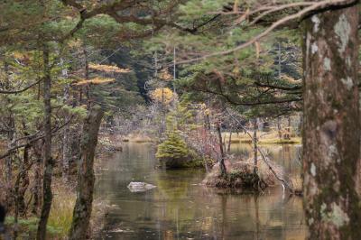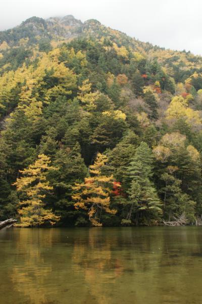 上高地散策で明神池、河童橋と同じくらい有名な大正池。紅葉の時期に訪れましたが、紅葉した焼岳をバックに絶景が広がります。焼岳の噴火で水没した林は幻想的な立ち枯れとなり、アクセントをくわえています。大正池のそばには大正池ホテルもあり疲れたらお茶もできます。