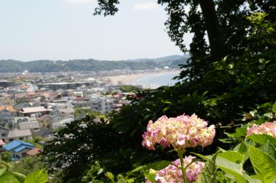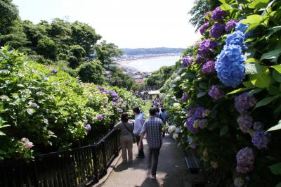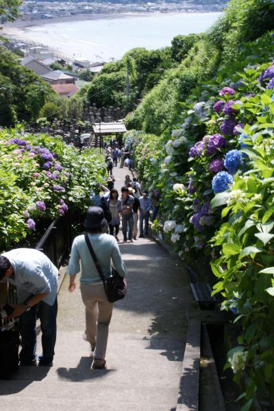アジサイを見に行きました。アジサイで有名なので混んでます。しかも番号札を配って入場規制もしています。数十分で入れますが入場規制まであるとは・・・。入場後、アジサイの中の階段を上ります。階段状に咲いているアジサイは見事。一番上まで行くと見晴らし台があり海が見えます。アジサイ越しの絶景です。