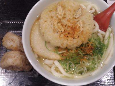 地域クーポン利用でまる天・ごぼう天・おどん」大盛り、持ち帰りでかしわおにぎり2個を注文しました。