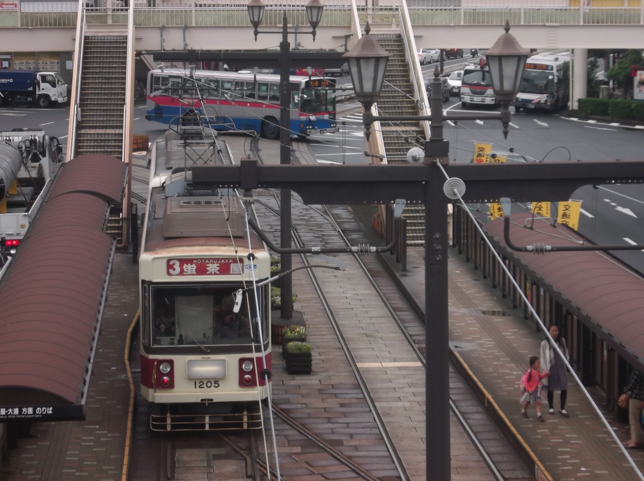 駅前電停では降りる人も多かったですが乗る人も多いです。