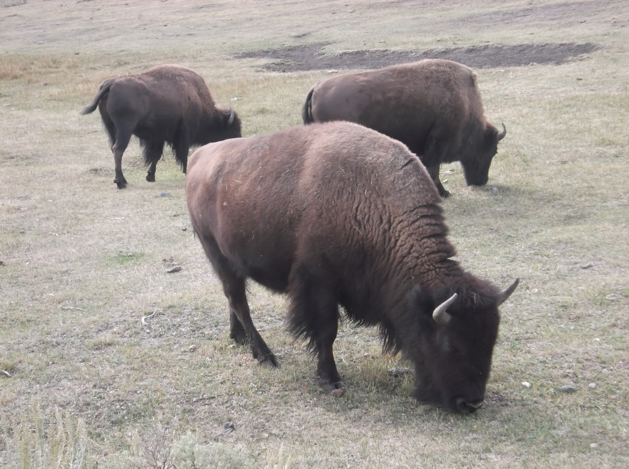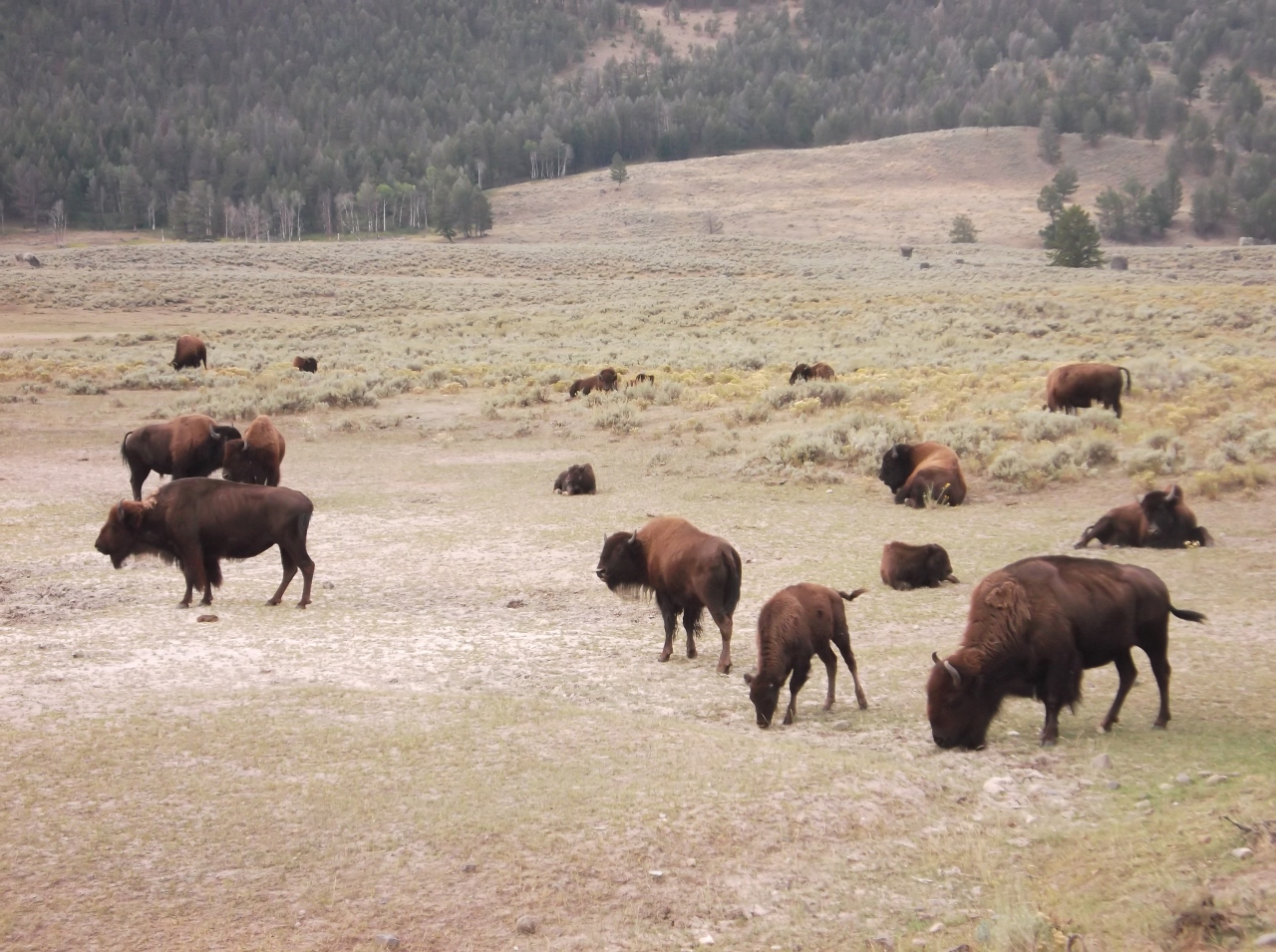 バイソンの群れがよく見れるヘイデンバレーやラマバレーで出会うことができず残念な気持ちでいたらイエローストーンレイクの近くの道端で群れに出会えました。