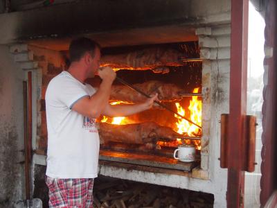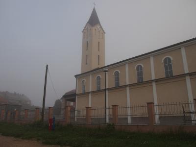 翌朝、朝霧が深く立ち込めていました。 近くに教会があると添乗員のMKさんより聞いていたので早速出かけました。 豚の丸焼きをしている光景に目が釘付けになりました。 6:00になると、教会の鐘が鳴り響きました。