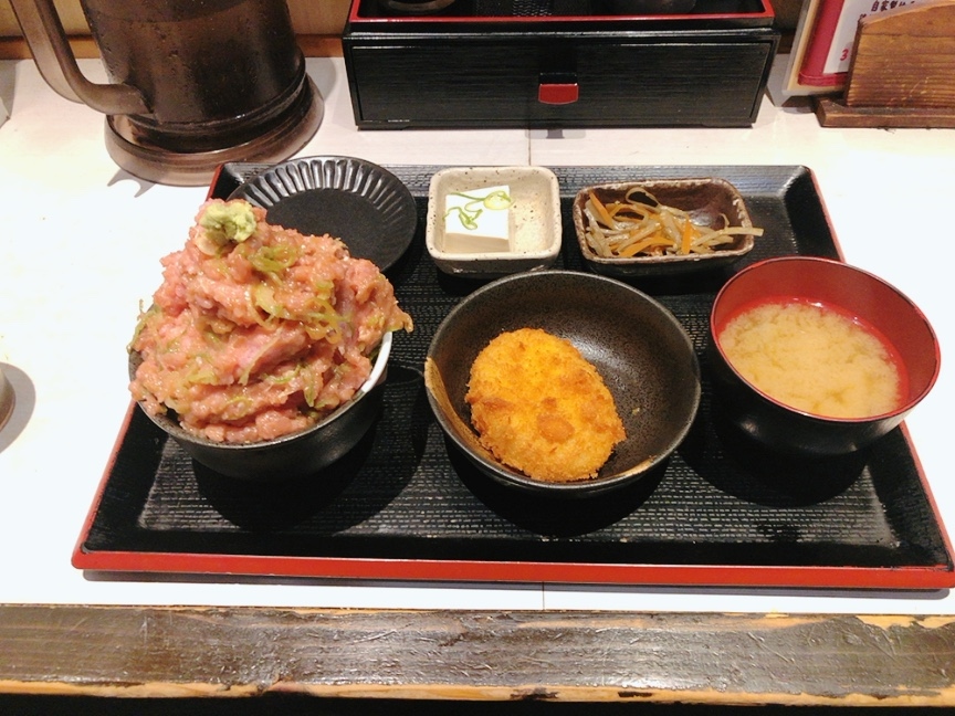 小さ目の丼にこんもりと大きく乗ったネギトロのみならず、総菜とコロッケがしっかりとセットでついてくる定食タイプのランチ。