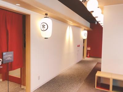 一階のロビーは広く開放的でガラス越しに箱庭、奥には男女別の大浴場がある。
