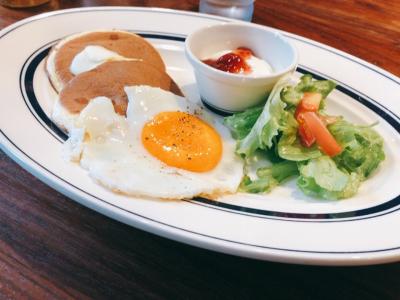 どら焼きほどのサイズ小ぶりのパンケーキ2枚にたっぷりのバター、目玉焼き、サラダ、ヨーグルトのシンプルなプレートにドリンクが付く。- 旅行時期