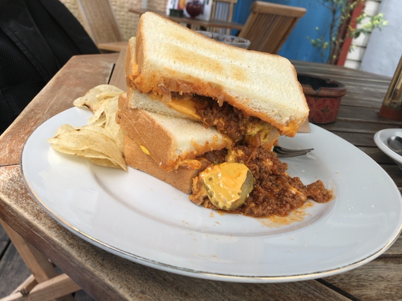 ふかふかの厚切り食パンを軽く炙って、チェダーチーズピクルスにたっぷりのスロッピージョーを挟んだ逸品。