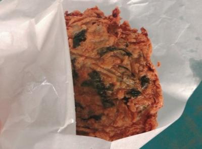 さつま揚げは、藤棚商店街の今井かまぼこ店の野菜揚げをホカホカに温めてくれる。- 旅行時期