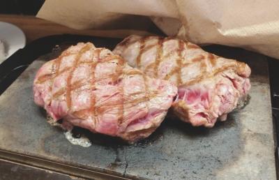 アツアツの溶岩石板の上にどっかと寝転がった150g×2の松ロースは分厚く迫力がある。- 旅行時期