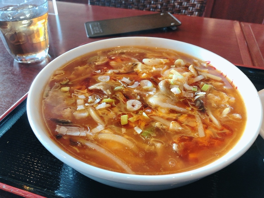 あんかけ風のサンラータンスープにはタケノコ、生姜、椎茸などの野菜と海老や烏賊の海鮮に豚の細切れも入っていてこれはとってもボリューミー。- 旅行時期