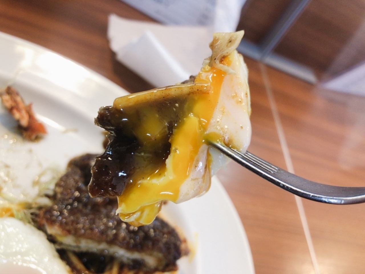 名物ランチはエビ、トンカツ、ハム、目玉焼きが乗って700円。