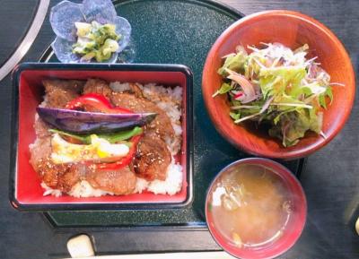 焼肉重は1500円(税込み)で味噌汁サラダにおしんこ付き。
