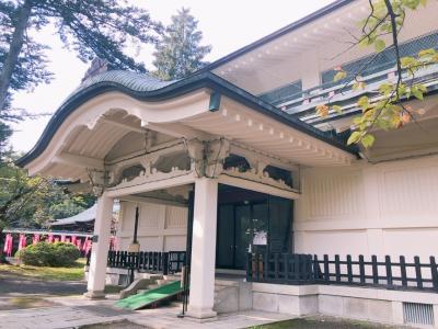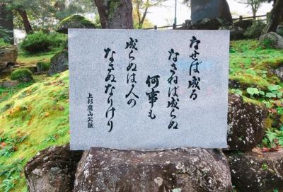 上杉謙信、上杉鷹山、上杉景勝と直江兼続の銅像が並び本堂は米沢城の本丸跡に堂々と建てられている。- 旅行時期