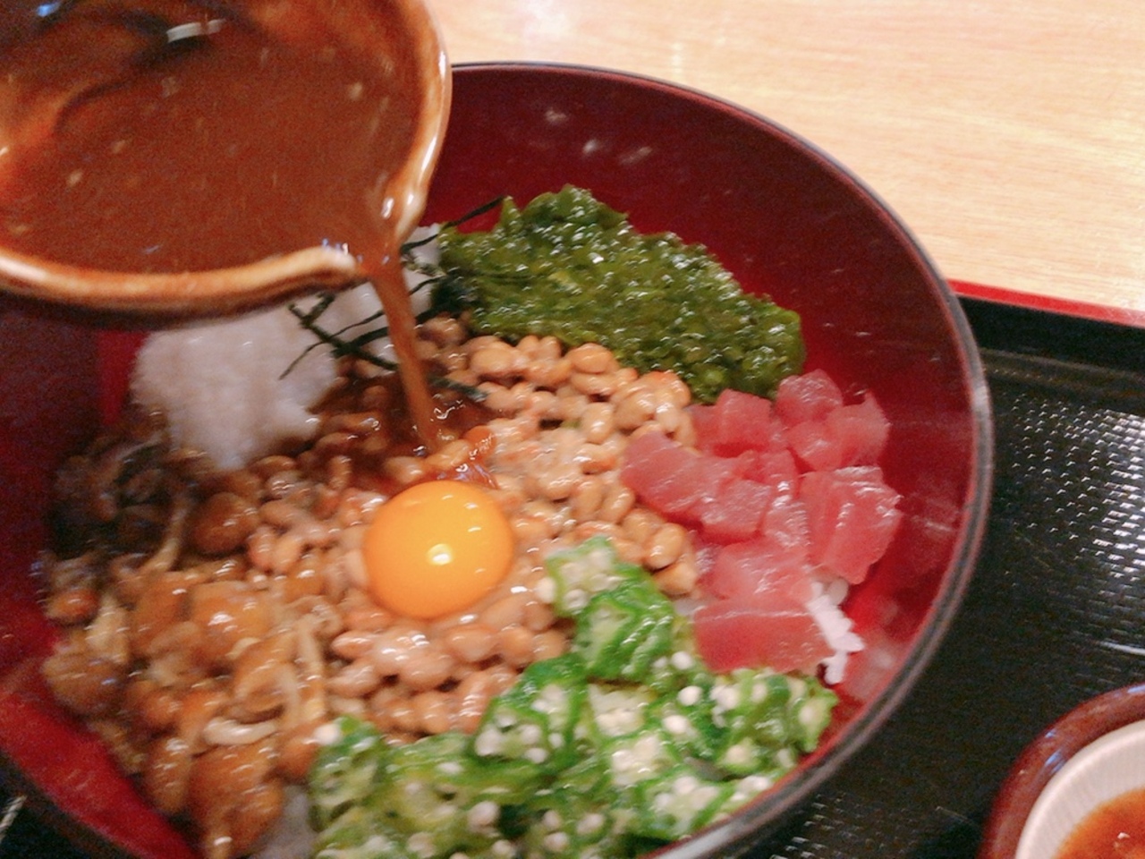 しらす、マグロ、いくらの三種類。白米にすし酢をかけて、その名の通りこぼれんばかりのネタを載せてくれる。