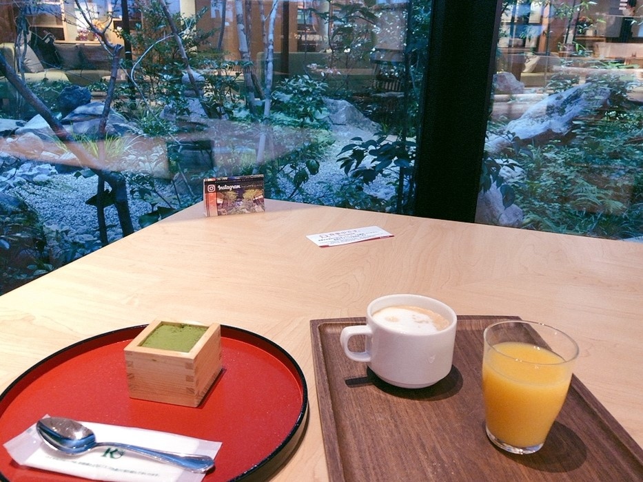 中庭を楽しみながら、升に入った抹茶ティラミスと珈琲を味わう。