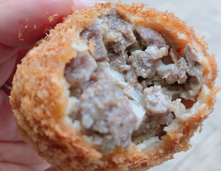 しっかり惹かれた玉ねぎのみじん切りとやわらかく上質のミンチに包まれたゆで卵。