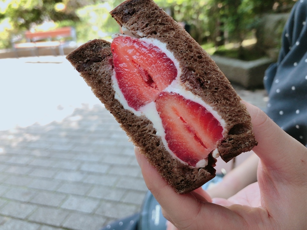 チョコレートが練りこまれた食パンの甘みと爽やかで果汁たっぷりのあまおうがそのまましっかりと挟まったサンドイッチはサンドイッチというより、むしろケーキに近い。- 旅行時期