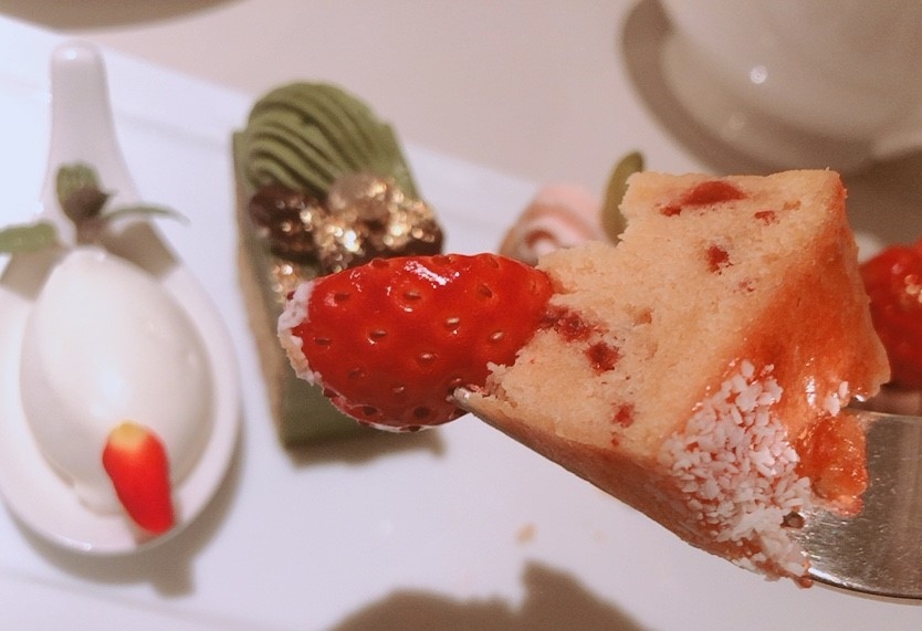 そのまま一口楽しみ次に生クリームをつけて味を変えて楽しむ。