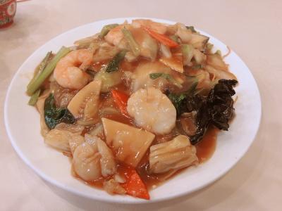 イカ 海老 貝柱などの海の幸やたけのこや青菜などの山の幸がたっぷり、かた焼きそばがたっぷりかかった具材に隠れて全く見えませぬ。