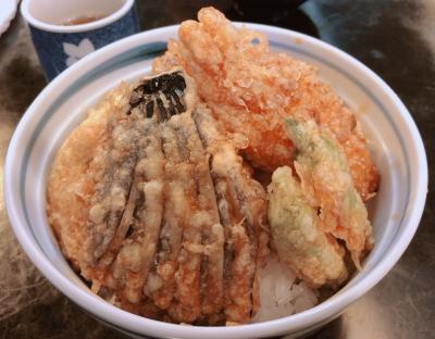 ご飯大盛で頼むと100円増しだが、その丼のサイズが一気に大きくなり、こんもりご飯をいろんな種類の野菜天がしっかり覆い包み込むようにトッピングされている。