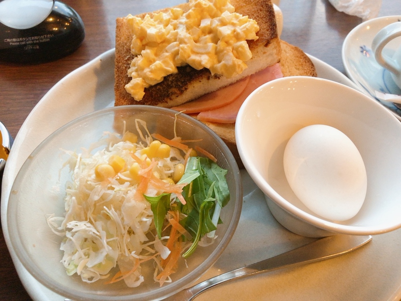 サラダ、ゆで卵に分厚い角食を使ったミックストーストがまさに店の名の昔ながらの喫茶店のモーニングメニュー。