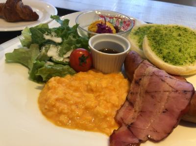 内容は、スープ、南瓜のサラダ、生野菜、スクランブルエッグ、ベーコン、ソーセージ、クロワッサンとマフィン。