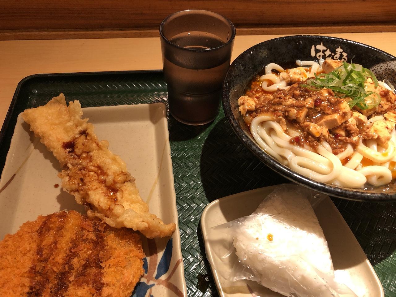 麻婆あんかけうどんの中と塩オニギリ、コロッケ、ちくわの天ぷらで1000円を超えてしまった。