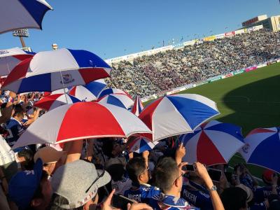 「あら、ブルーの服ってことは対戦相手のサポーターの人? 大丈夫、前節、勝ったから、今日も勝ってくれるわよ。来年も来てね~。」