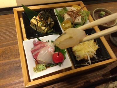 前菜はサラダ、出汁巻、お刺身に、長芋とチーズの天ぷらの4種類。