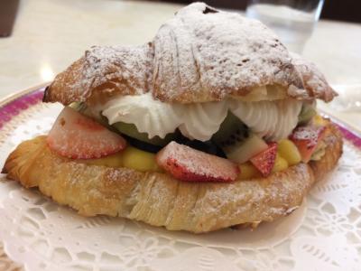 パリパリのクロワッサンを半分に切りカスタードクリームの上にフルーツを5種類盛り生クリームをその上からしっかり載せた食事にもデザートにもなる逸品。
