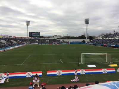 ピッチが近いことから人気はあるけれど、初めてゴール裏の高い位置に陣取りそこから観戦。