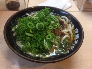 大阪風のゆるゆるのうどんに、甘辛く煮た肉と生姜が関西出しにすごくあう。