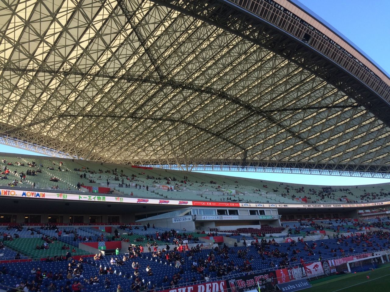 日本最大のサッカー専用スタジアムとしてどこから見ても近くて見やすいし、トイレもきれい。カップホルダーも各席についている。