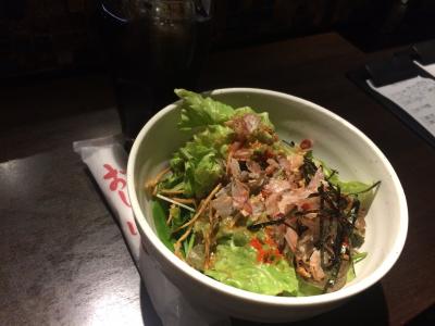 さっぱりしたサラダに始まり、土手焼き、焼き鳥と一工夫ある料理が次々とやってくる。