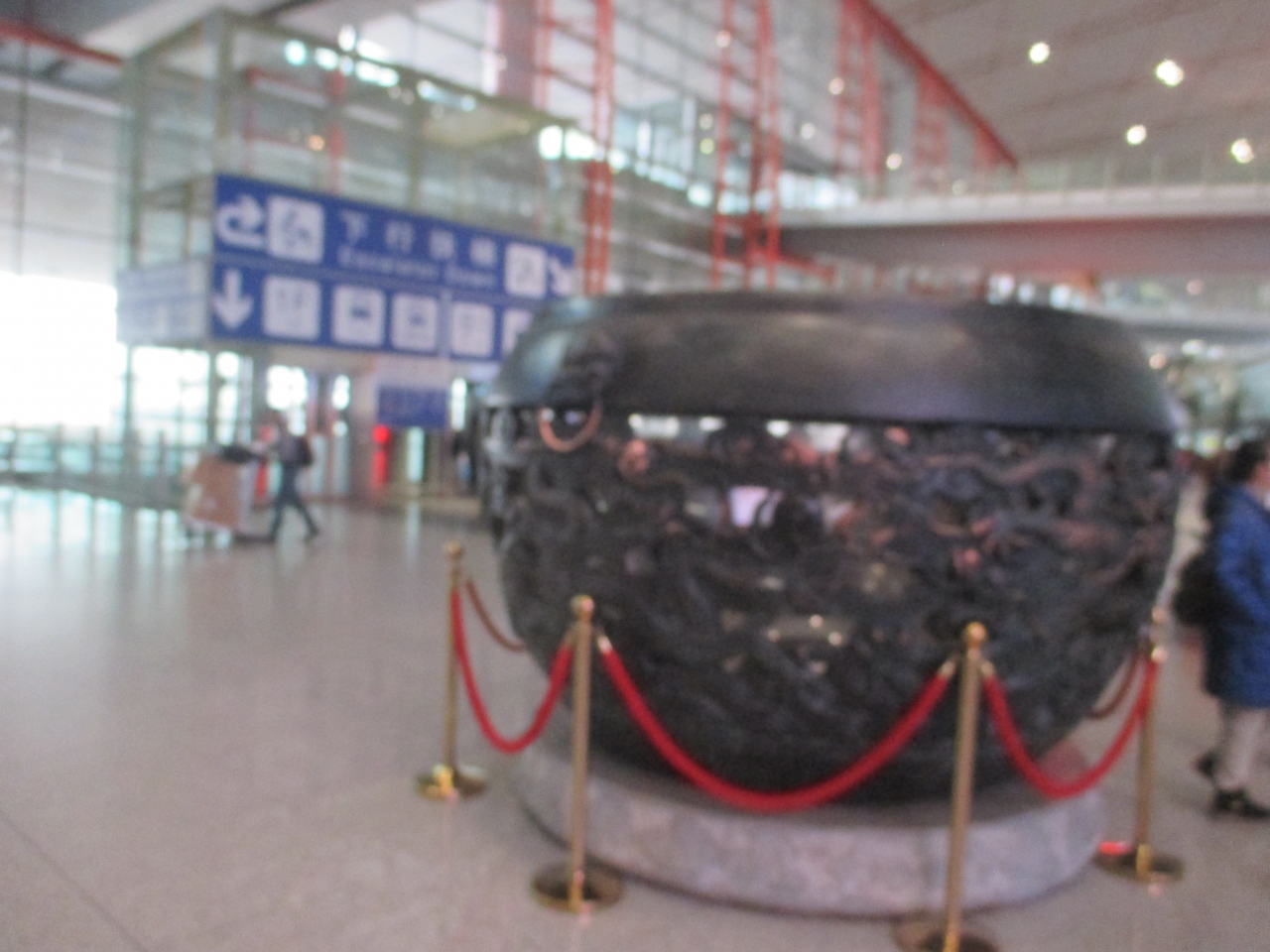 北京空港で羽田から、T3Eの国際線ターミナルに到着しました。電車に乗るためにT3Cターミナルに向かいます。税関を抜け、ターミナルを出ると、大きな黒い壺?が出迎えてくれます。中国の大きさを感じられる芸術品です。