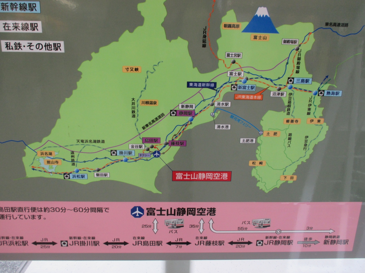空港にあった、静岡県の地図です。東海地方出身でないとなかなか静岡県の形ってわからないですよんね。こんな形だったんですね。空港はお茶畑の牧之原や御前崎に近い場所にありますね。この空港の本家のフジドリームエアラインズのカウンターが中央にありました。静岡に拠点のある「鈴与」さんという会社の航空会社ですね。