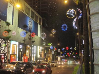 くアラルンプ―ルの中心街にある。パビリオンというショッピングモールの前から取った写真です。夜になると、電線に丸い電球の電飾が点灯して、カラフルで綺麗でしたよ。これで