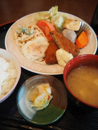 この日はアジフライ、目玉焼き、サラダ、パスタサラダ、煮っ転がしがワンプレートに盛られていて、他に漬物、味噌汁、ご飯が提供された。